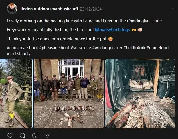 Chiddinglye “is a private home set in a magical garden in the middle of a working farm on a plateau in the High Weald, intersected by deep wooded valleys with sandstone outcrops. We are an Area of Outstanding Natural Beauty and a Site of Special Scientific Interest…”. Chiddinlye likes to promote its green credentials (The Captain Paul Watson Foundation was present at the Into the Wild festival in August 2025 which was held at Chiddinglye Farm on the estate), but a bit of digging finds that even though in an AONB and SSSI (and not mentioned on their website) the estate is part of the shooting industry, hosting the shooting dead of non-native pheasants…