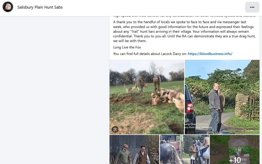 - Salisbury Plain Hunt Sabs: Royal Artillery Foxhounds. Hosted by: Lacock Dairy Ltd (Facebook, September 2025)